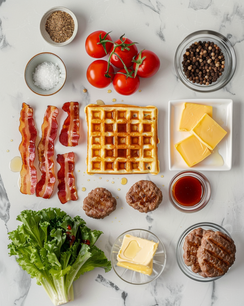 - For lower calories/fat: Use 93/7 lean ground beef, turkey bacon, and reduce waffles to 6 per burger (open-faced style).