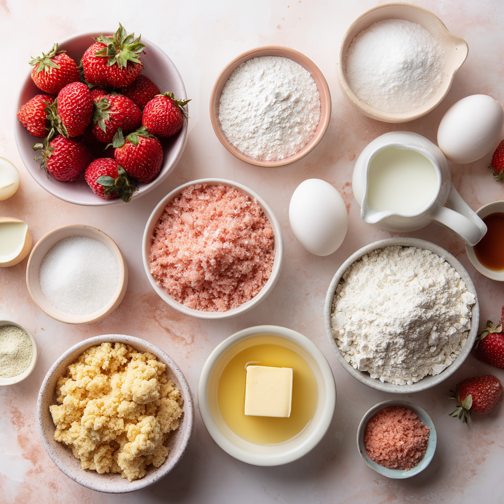 Main ingredients: Strawberry cake (often from mix or scratch), cream cheese frosting, strawberry crunch topping (Golden Oreos + freeze-dried strawberries + butter).